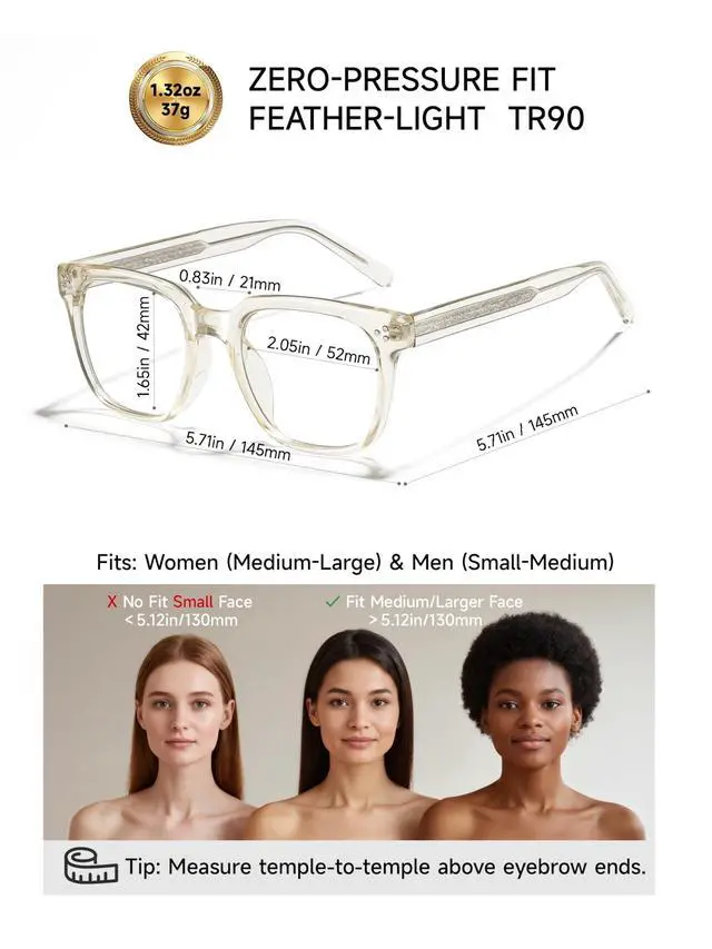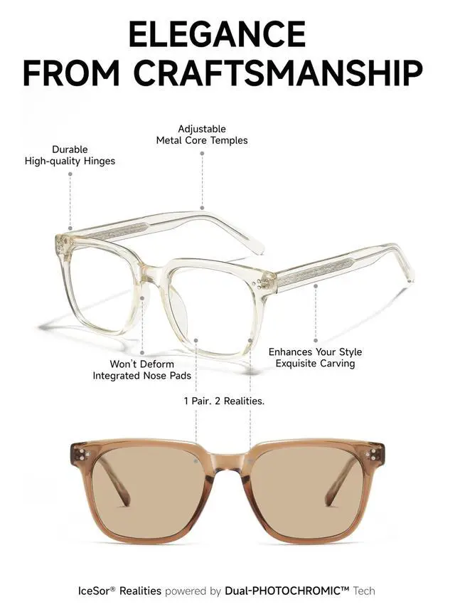 CRAFTSMANSHIP] Beyond mere plastic: The premium TR90 frame is integrated with an adjustable metal core within the temples. This exquisite interior carving ensures the frame maintains its "Full-Unit" integrity while offering a personalized fit that lasts for years. ^^ [INTELLIGENT DUAL PROTECTION] Your 24/7 digital and solar armor. Our lenses block 99% of harmful blue light indoors (with a subtle micro-amber tint) and provide full UV400 protection outdoors. One frame, two realities, zero compromise on eye health. ^^ [FEATHER-LIGHT ERGONOMICS] Engineered for all-day wear. Weighing only 1.32 oz (37g), the zero-pressure design and integrated nose pads eliminate fatigue. The smart-adapting frame ensures you look sharp whether you're in a boardroom or at a beach club. ^^ [THE MINIMALISTS ULTIMATE HYBRID] Master the art of the switch. IceSor eliminates the need to carry separate sunglasses. Its the ultimate hybrid for high-paced professionals who demand cutting-edge tech wrapped in a luxury, minimalist silhouette.