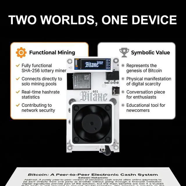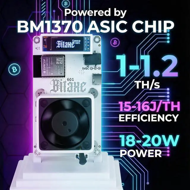 BM1370 ASIC Chip: Powered by a single high-performance BM1370 ASIC chipoptimized for SHA-256 Bitcoin miningthe Bitaxe Gamma 601 delivers a reliable hashrate of 1TH/s to 1.2TH /s. Boasting an impressive energy efficiency of 15-16J/TH, it operates on just 18-20W of power, making it ultra-cost-effective for home use. Perfect for beginners, blockchain enthusiasts, or anyone looking to experience solo mining without heavy electricity bills. ^^ Bitcoin Ethos & Satoshi Commemorative