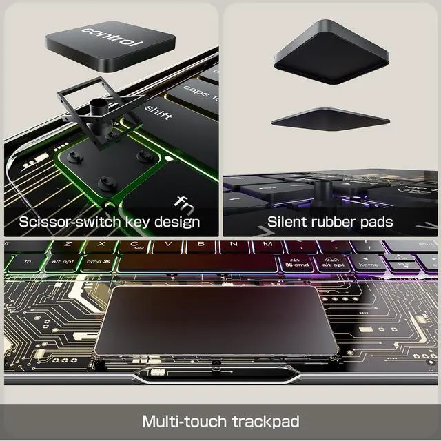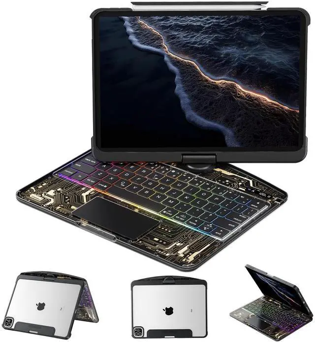 ^^ 7-Color Backlit Keyboard: This keyboard for iPad pro 13 inch features a dynamic 7-color RGB backlit keyboard with three adjustable brightness levels and silent tactile keys. The iPad pro 13 inch case keyboard allows you to personalize your typing with a spectrum of colors and optimal brightness for any environment, while the whisper-quiet silent keys ensure distraction-free use in meetings, libraries, or late-night sessions, combining vibrant customization with serene productivity.