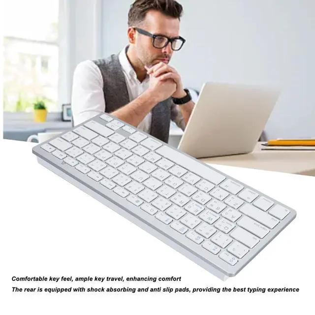 [Bluetooth Connection] Simply connect to your mobile devices (such as tablets, computers, or phones) via Bluetooth to start typing, no software or drivers needed. Operating range up to 10 meters (33 feet) for added convenience. ^^ [Comfortable Typing] This keyboard features a slim design and attractive scissor switch for efficient typing. The responsive keys with ample key travel ensure a comfortable typing experience, even during extended use. ^^ [User Friendly] The rear of the keyboard is equipped with shock absorbing and non slip pad for optimal typing experience. Enjoy improved comfort with this ergonomic design.