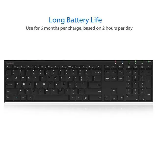 ^^ Package contents: Arteck Stainless 2.4G Wireless Keyboard, nano USB receiver, USB charging cable, welcome guide, our 24-month warranty and friendly customer service.