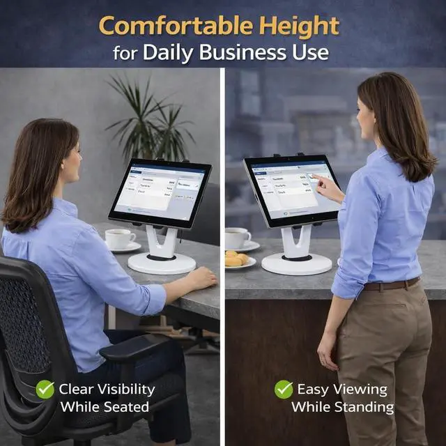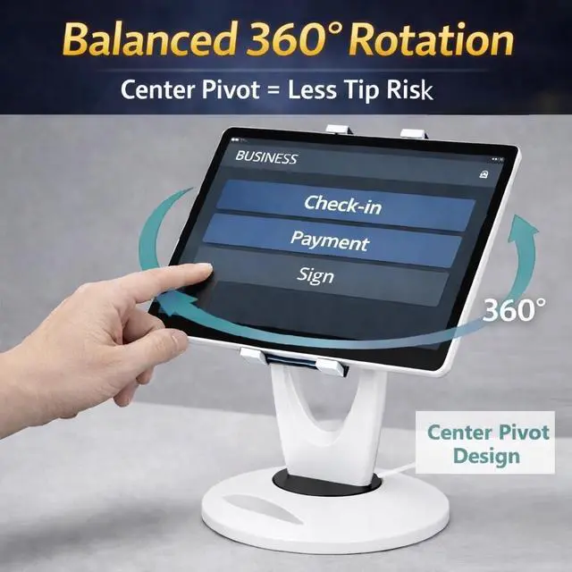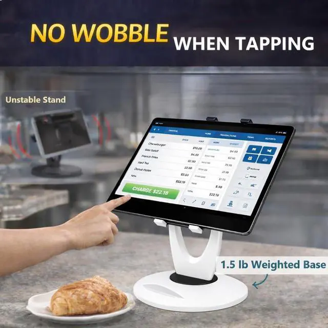 NO WOBBLE WHEN TAPPING Extra-Heavy Base Built for Daily POS Use Extra-heavy weighted base keeps your tablet rock-solid during tapping, swiping, and checkout. Designed for retail, restaurant, and front-desk environments where stability matters. ^^ Balanced Weight, Not Bulk Stable Without Taking Over Your Counter Engineered for balance, not bulk. Heavy enough to stay firmly in place, compact enough to keep your workspace clean and professional. ^^ Built-In Handle for Effortless 360 Rotation Integrated handle makes screen rotation smooth and intuitiveideal for sharing screens with customers without lifting or adjusting the base.