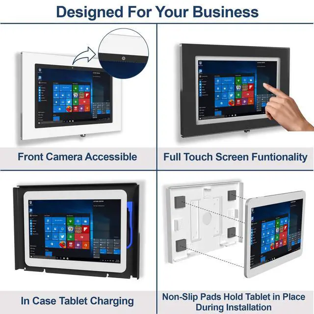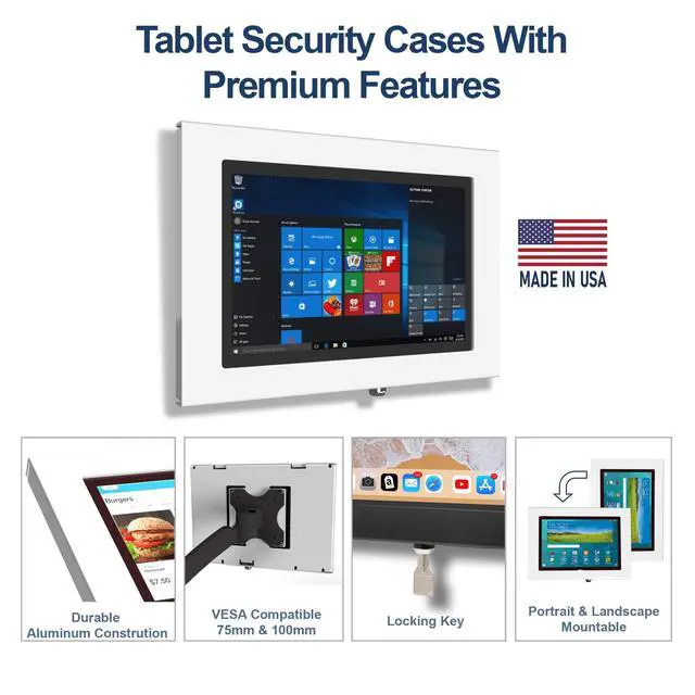 Weight: 1.5 lb ^^ Total Screen Access For Full Touch Function, Install In Seconds! One Push Button Lock, Anti-theft security design ^^ Use as Time Clock, POS, Kiosk, Store Display, Trade Show display ^^ Wall Mount Ready! Supports VESA mounting kit with 75mm & 100mm standard for both Landscape and Portrait Display Modes