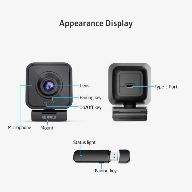 2.4G Wireless Connectivity Webcam20m indoor range and up to 50m wide open sight area 2.4G wireless transmission distance, you can place the camera in any location in real time without cable connecting, meet your video conferencing needs in any conference room. ^^ Wireless USB Plug and PlayTOALLIN wireless webcam comes with a USB receiver for the computer side, it was paired with the camera before we shipped, just plug the USB receiver to the computer USB interface and press the camera's power button, then enjoy your video time. ^^ 1080p HD Resolution & Wide Angle CameraThis computer web camera using the 1080p 1/ 2.9" CMOS sensor, 2 Million Pixels, can outputs clear and high video quality up to 1920 x 1080@30fps.
