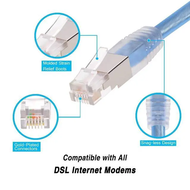 Compatible with all DSL Modems ^^ Ultra-Flexible see trough jacket ^^ Gold plated connectors to avoid corrosion and provide maximum connectivity ^^ Snaggles molded boot and effective strain relief ^^ Double shield (foil and braided shield) to reduce EMI