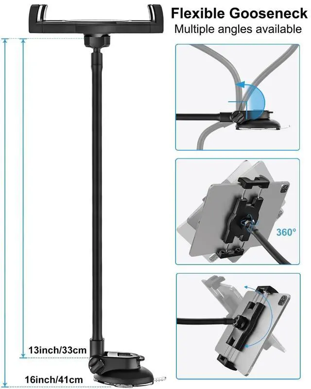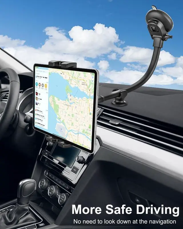 Versatile Long Arm Car HolderThe car holder designed for tablet and smart phone. You can easily install the suction cup to windshield or dashboard with no tools needed. 13" extra-long, ultra-flexible arms allow you to easily adjust the device within reach and easily access your tablet screen. Strong compatibility, not only suitable for small cars, but also for large trucks. Perfect for navigating, watching movie, shooting live, browsing web, or making video call use while break. ^^ 360 Degree RotatableThe tablet holder phone mount for car windshield features a 360-degree rotating head and a flexible gooseneck arm, which ensure your iPad can be positioned horizontally, vertically, or at any angle as well as keeping your phone visible and handy on any road.