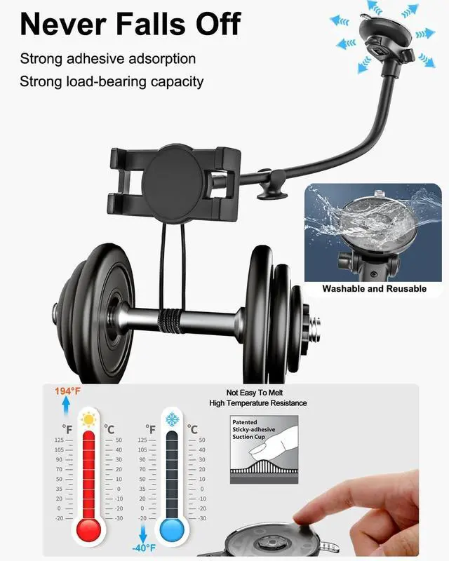 You can freely adjust the bendable long arm to within reach position to ensure your more relaxed and safer drive. ^^ Enhanced Washable Suction CupThe suction cups are made of high viscosity silicone material, it is sticky and you can stick the suction cup securely to the car windshield, dashboard or other smooth surface. when the viscosity is insufficient, you can wash the sucker base and then let it air dry, the suction power will as always. This suction cup can withstand -4-158 temperature, no matter a brake hard, a sharp turn, or driving on bumpy road or at extreme weather, it is always stable.