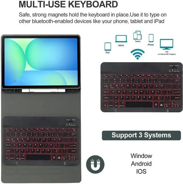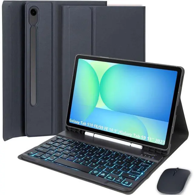 Release 10.9 inch (Models: SM-X520/SM-X526/SM-X526B) Samsung Galaxy Tab S9 FE 5G 10.9 inch (Models: SM-X510/X516B/X518U) and also compatible with Galaxy Tab S9 11 inch (Models: SM-X710/X716B/X718U) 2023 Release. Please verify your tablet's model number before purchasing to ensure a perfect fit. ^^ Wireless 7-Color Backlight KeyboardOur for Samsung Galaxy Tab S10 Lite/S10 FE/S9 FE 10.9 ''/Galaxy Tab S9 11'' Bluetooth backlit keyboard has 7 adjustable backlight colors and breathing light backlight mode that switches automatically. The keyboard can be used in the dark, ensuring clear visibility and matching your mood and environment in any lighting conditions. ^^ Wireless MouseNavigate easily with the included mouse, which can perfectly complement your for Samsung Galaxy Tab S10 Lite/S10 FE/S9 FE 10.9 ''/Galaxy Tab S9 11'' tablet keyboard. This mouse provides precise control and smooth operation, adding a touch of sophistication to your tablet overall. ^^ Adjustable Viewing AnglesThe protective for Samsung Galaxy Tab S10 Lite/S10 FE/S9 FE 10.9 ''/Galaxy Tab S9 11'' case Keyboard transforms into a versatile stand, offering multiple viewing angles in landscape mode. Whether typing, watching movies, or video calling, easily find your ideal angle for optimal productivity and comfort. ^^ Comprehensive Protection CoverExperience enhanced drop protection with a premium PU leather exterior and a soft TPU inner back, for Galaxy Tab S10 Lite/S10 FE/S9 FE 10.9 ''/Galaxy Tab S9 11'' Keyboard case built-in pen slot ensures your S Pen is stored securely, making it easy to carry and access your pen whenever you need it