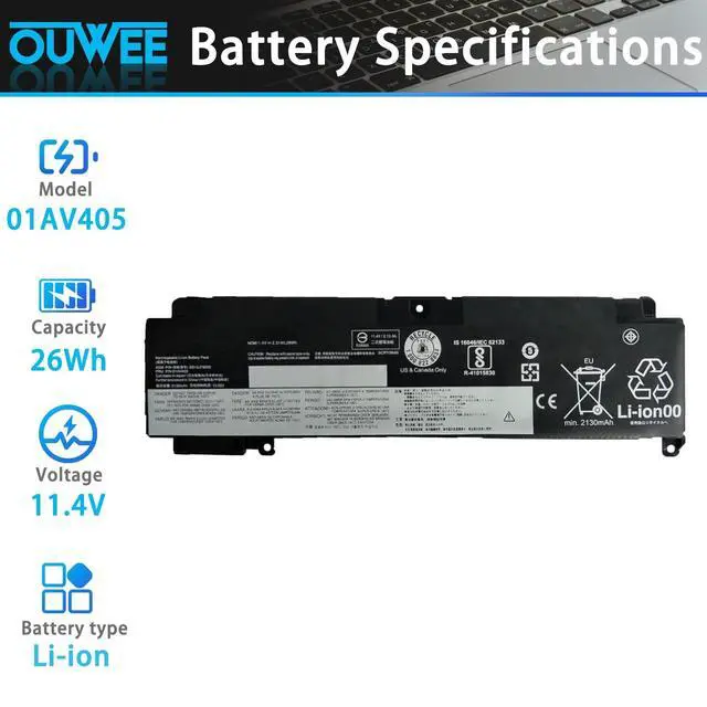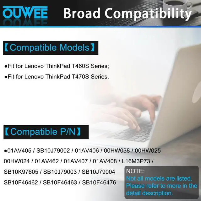 (Purchaseing Note: There are 2 battery of the T460S/T470S laptop, Please choose the which one you are going to replace and according to your laptop's original battery) ^^ CertificateAll OUWEE products are Certified by CE, FCC for safety. Strict guidelines for compatibility, and standards compliance for environment safety. ^^ OUWEE Worry-Free Warranty ServiceRest assured with 30 days Refund and 12 months Replacement, also get our friendly customer service.
