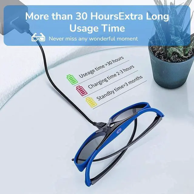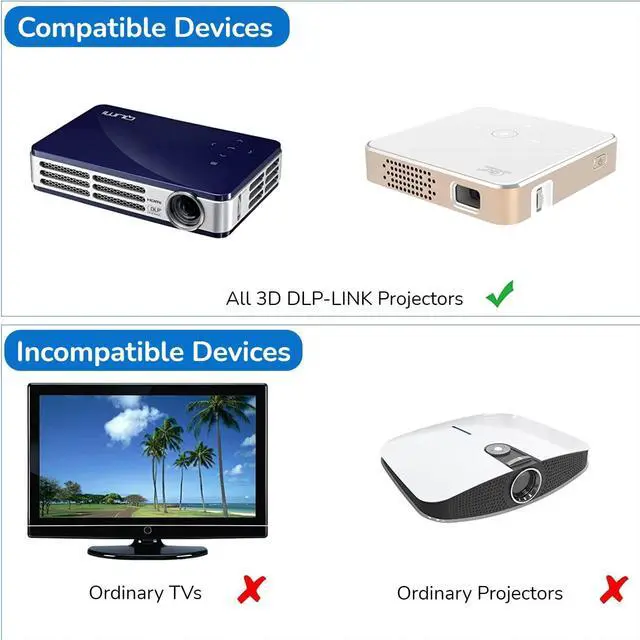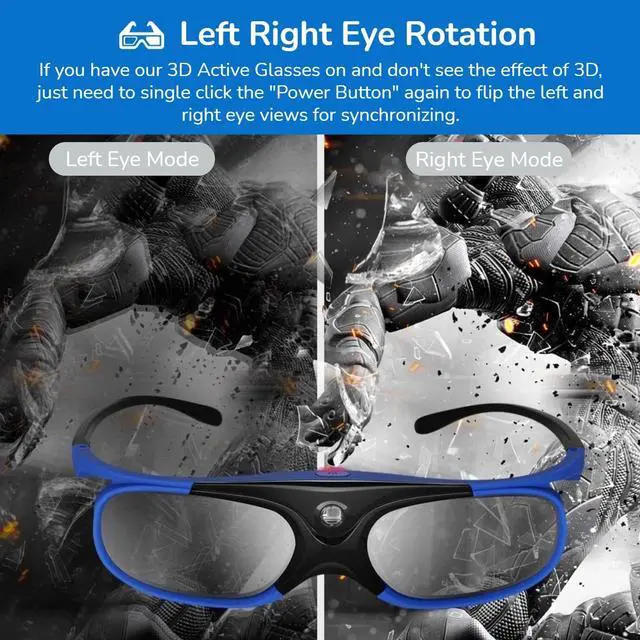 [COMPATIBILITY]Support various 3D technology DLP LinK projectors, for ZX4 H1, for G1 G3 X1, for Ben Q, for for Optoma, for for, etc. (does not support monitor, ordinary, infrared, Bluetooth 3D projector, Ordinary TV) ^^ [QUICK CONNECT WITH DLPLINK PROJECTOR]The active shutter 3D glasses use "DLP Link" their sync method, quickly work with all DLP Link projectors. Built in 80 mAh lithium battery, rechargeable to provide you with long working hours. ^^ [OUTSTANDING PERFORMANCE] Our DLP Link 3D glasses adopt the newest active shutter technology, super fast 144Hz refresh rate, High definition, no ghosting images, no flickering, delivers a great 3D viewing experience for you! ^^ [LEFT RIGHT EYE ROTATION]If you have our 3D Active Glasses on and don't see the effect of 3D, just need to single click the "Power " again to flip the left and right eye views for synchronizing, very convenient, no need to operate the DLP projector.