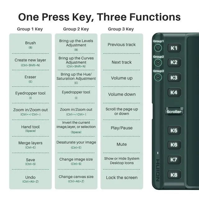 Programmable Scroll & Shortcut Keys: Unique scroll wheel & 8 press keys can be customized to your favorite shortcut so that your creative work become smoother and more efficient. You also can change the setting for different apps.