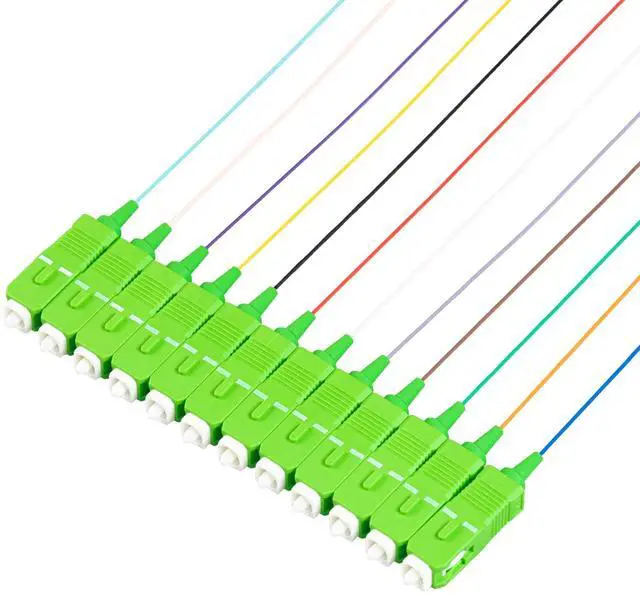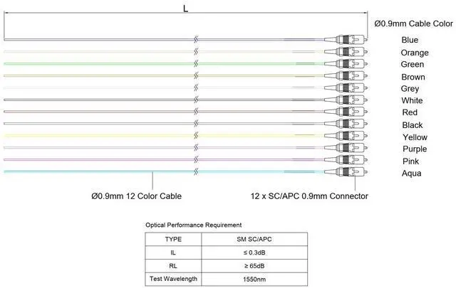 SpeedyFiberTX - 12 Fiber 900um Fiber Optic Pigtail, Corning SMF-28 Singlemode 9/125um Ultra Optical Fiber, OS1/OS2 CompatibleSpecifications Insertion Loss UPC 0.2 (dB) / APC 0.3 (dB) Return Loss UPC 50 (dB) / APC 65 (dB) Attenuation at 1310nm 0.32 (dB/km) ^^ at 1550nm 0.18 (dB/km) Operating Wavelength 1285nm - 1625nm Operating Temperature -20C to +70C Ferrule Material Ceramic Compliance ITU, UL, CE, IEC, TIA, RoHSFeatures and Benefits900um tight buffer cable and durable plug and play connectors for easy deployment Easy to identify fiber channels with 12 color-coded cable Lightweight and flexible 900um Riser OFNR tight buffer jacket Every connector termination is tested to ensure the quality in network performance Proprietary manufacturing process and advanced technology result in quality guarantee
