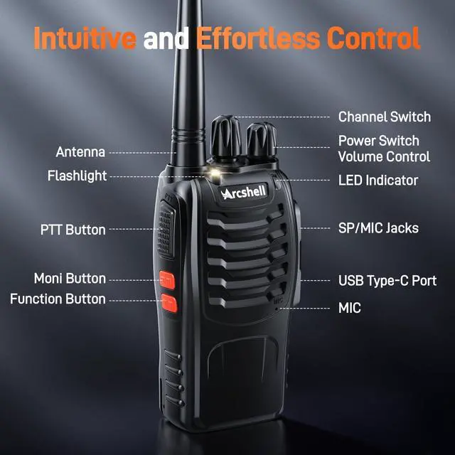 FCC ID: 2ARTCARAR ^^ 16 channels; each radio has identical frequency on each of the 16 channels out of the box; 16 position mechanical rotary switch channel selector; when you turn the knob to change the channel, a synthesized voice will tell you the channel number ^^ Each radio comes with a 1500mAh rechargeable Li-ion battery and a charging dock; the charger comes with an AC wall-wart Type A plug and works in 110v-240v; it takes about 2.5 hours to fully charge; battery life is determined by transmit time; it lasts around 8 to 96 hours on a single charge depending on how much you transmit; you can charge the battery alone or charge the radio with battery installed; Arcshell AR-5 has a USB Type-C Charging Port now ^^ High quality built-in speaker on the radio provides loud and crystal clear sound; Push-to Talk button and built-in mic on the radio; each radio comes with a single-earbud style earpiece (foam piece included) with a microphone built in and a Push-to-Talk button; earpiece plug is K-type of 3.5 mm plug and 2.5 mm plug; when you plug in the earpiece, all sound goes to the earpiece and the radio speaker is silent; the radio has a VOX function for hands-free operation ^^ Range is very dependant on terrain; up to 5 miles with no obstructions, less in congested area; work great in a commercial construction or around the house; suitable for security team; maintenance team; construction team; warehouse; factory; police; airsoft; kitchen staff; hotel; retail store; at the school; events communications; roadtrip while driving in different cars; family camping and hunting; on a cruise ship; in mountains; it works worldwide; you can add as many as you want and they work great together ^^ Introducing the Upgraded Arcshell AR-5 Exclusive Version! Your favorite walkie-talkie just got even better! Building on the success of the million-plus Arcshell AR-5 two-way radios sold, we now proudly present the upgraded and exclusive Arcshell AR-5.