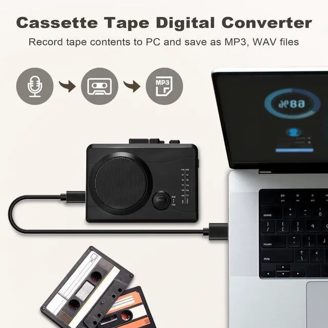 Tape Conversion FunctionThis cassette digital converter can convert tapes to MP3 digital, and can also record in reverse, recording music, voice from PC to blank tapes.