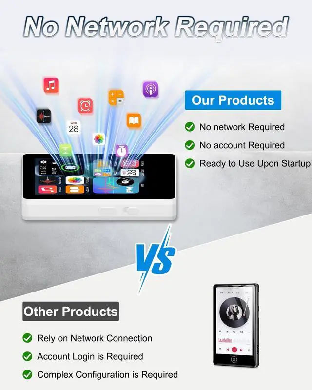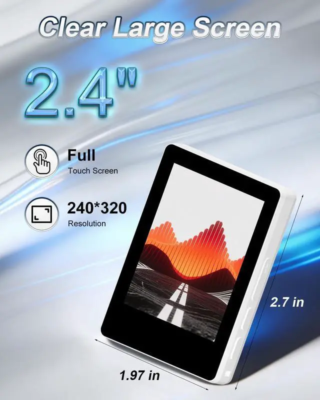 Bluetooth combines five core functions: Music, Recorder, Ebook, FM Radio, and Picture Viewing. No account registration requiredpower on and use immediately. Intuitive operation with enhanced privacy. ^^ 2.4 '' Full Touch Screen 2.4 -inch full touch screen offers responsive sliding control and smooth navigation. 240*320 HD resolution ensures sharp text and detailed graphics for comfortable viewing. ^^ Smart Index SelectionAlphabetical index allows instant song search by title for precise selection.