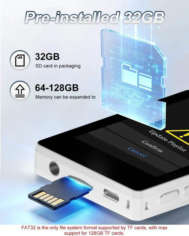 Bluetooth 5.2 Wireless ConnectionPortable MP3 Player Advanced Bluetooth 5.2 technology ensures stable connectivity, efficient data transfer, and extended battery life. Easily pair with wireless earbuds or speakers for instant setup. Enjoy a seamless wireless music experience anytime, anywhere without cables. ^^ Ample Expandable StorageMini Music Player Pre-installed with a 32GB memory card, store and play a huge amount of music instantly. Supports TF card expansion up to 512GB (sold separately), offering flexible storage management for both local and expanded content. (Memory cards only support FAT32 format. ) ^^ Hi-Fi Immersive Sound Portable Kids Bluetooth MP3 Player built-in Hi-Fi speaker delivers clear vocals, powerful bass, and an immersive listening experience.