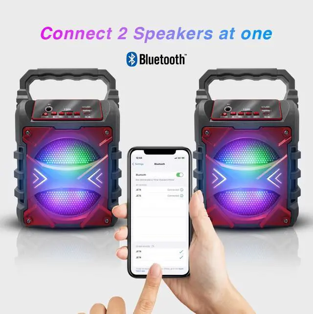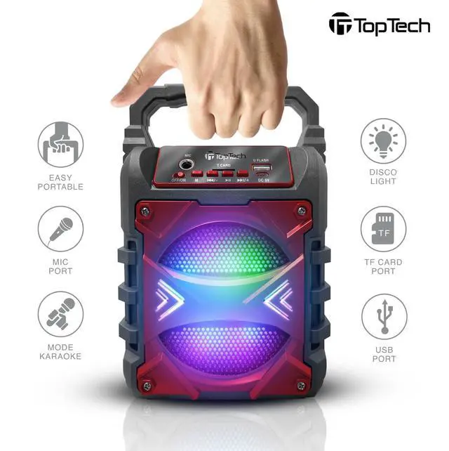 POWERFUL AUDIO PERFORMANCE: Experience incredible sound quality with peak power. The Top Tech Jet-4 Bluetooth Speaker delivers loud, crisp audio and deep bass, making it perfect for parties, outdoor gatherings, or any event where powerful sound is essential. ^^ TWS FUNCTIONALITY FOR IMMERSIVE STEREO SOUND: Maximize your music experience with True Wireless Stereo (TWS) technology. Pair two Jet-4 speakers together to create a powerful stereo setup, filling any space with dynamic, immersive sound that enhances any party or event. ^^ DISCO LIGHTS TO ENHANCE YOUR EVENT: Turn any space into a lively party zone with the Jet-4s built-in disco lights. These vibrant, pulsing lights sync with the rhythm of your music, creating an exciting and colorful atmosphere thats perfect for celebrations and entertaining. ^^