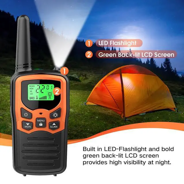 Walkie Talkies with 22 FRS Channels MOICO Walkie Talkies for Adults with LED Flashlight VOX Scan LCD Display, Long Range Family Radios for Hiking Camping Trip (Orange, 4 Pack)