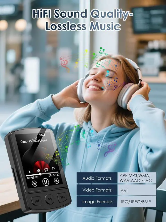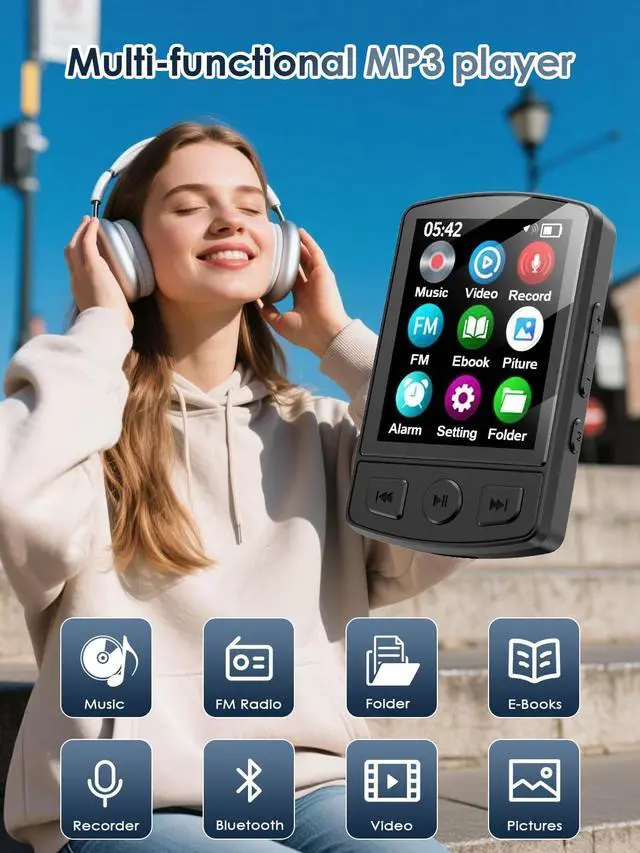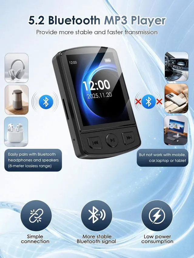 Wonderful for On-the-GoMP3 player come with ultra-portable & compact( 2.36 in long and 1.2 ounces)are perfectly sized for active lifestyles. The upgraded stable clip can let you easily attach it to your workout clothes, backpack or belt, keeping it secure and accessible whether youre running, sorting or hikingno more fumbling with bulky devices during movement. ^^ 5.2 Bluetooth MP3 PlayerBuilt-in upgraded Bluetooth 5.2 technology for wider compatibility (works with most Bluetooth headphones/speakers) and a more stable, drop-free connection. A professional digital noise-canceling chip reduces ambient interference, preserving the original audio details for Hi-Fi sound quality.