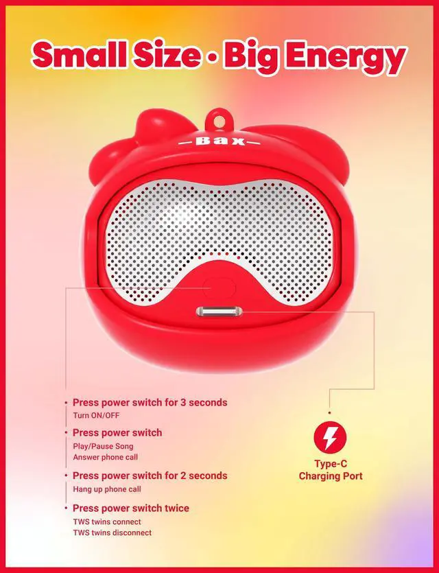 Contents: Mini speaker, USB A to USB C cable, carry strap, instructions, display box