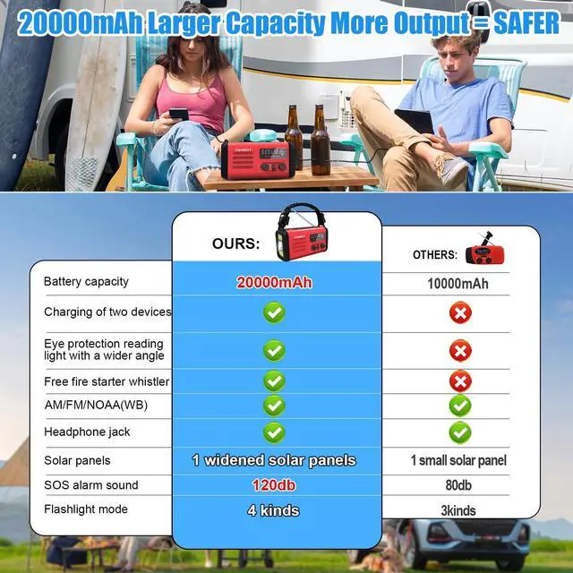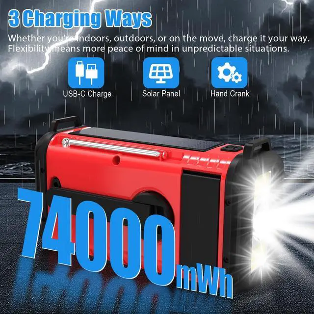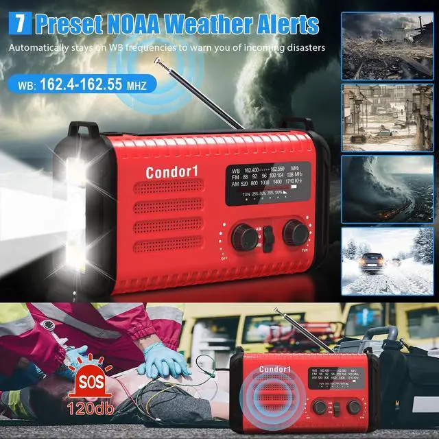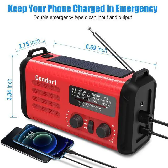 POWER BANK: Built-in 20000mAh 74000mWh charges 3 ways: hand crank, solar, USB. Condor 1 supports charging two devices simultaneously, Perfect for weeks-long outages or wilderness tripskeeps devices powered so you never miss critical weather updates.