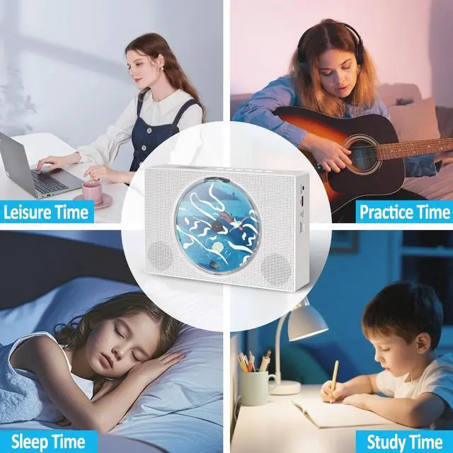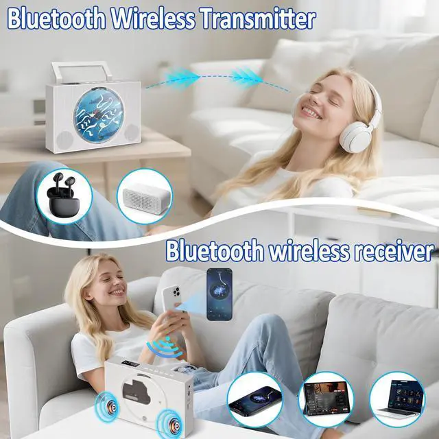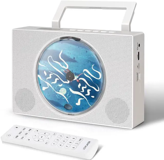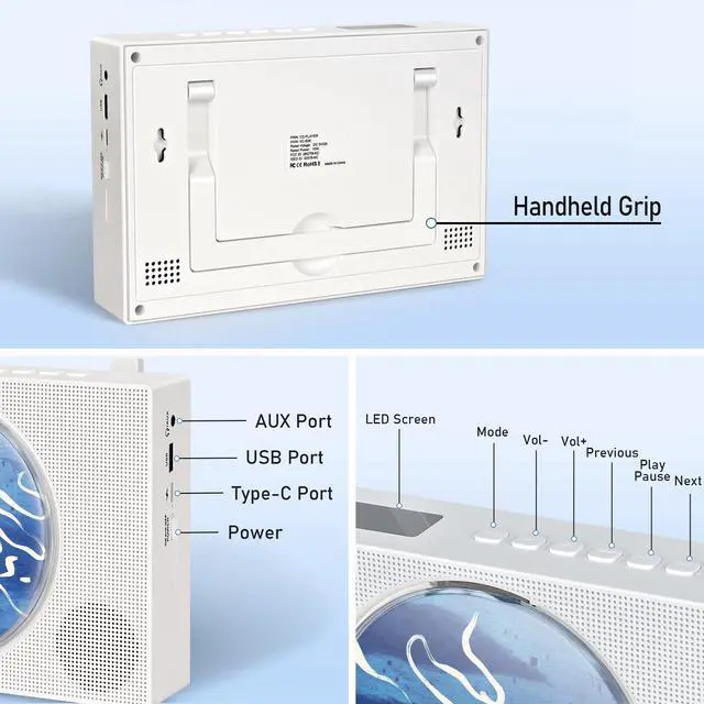 CD player offers multiple modes: CD mode, Bluetooth mode, FM Radio mode, USB mode, and AUX mode. Switching between modes is simple, catering to your diverse daily needs. The portable CD player is equipped with a wireless remote control and an LCD display for easy operation. The built-in dust cover can be opened at a wide angle, making it convenient for users to insert and remove discs while also protecting them from dust. ^^ [Portable CD Player with Bluetooth two-way Transmission] - This CD player with speakers supports Bluetooth 5.0 reception and transmission functionality for stable and fast wireless connections. When the Bluetooth reception function is enabled, CD players can play music from smartphones, tablets, laptops, MP3 players, etc. It can also use the Bluetooth transmission function to send music from CDs to Bluetooth headphones or Bluetooth speakers. ^^ [Handheld, Desktop, Wall Mounted Designs] - This Bluetooth CD player is uniquely designed with a portable handle for children and the elderly, making it easier to carry when traveling. Wall CD Player can be hung on a wall hook as a decorative item to save space, or placed on a desk in the bedroom to enjoy beautiful music every day before sleep.