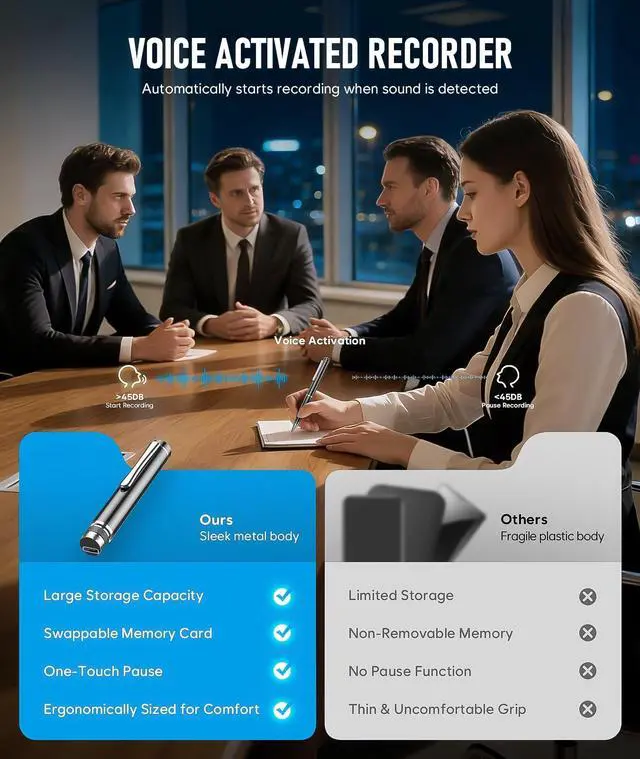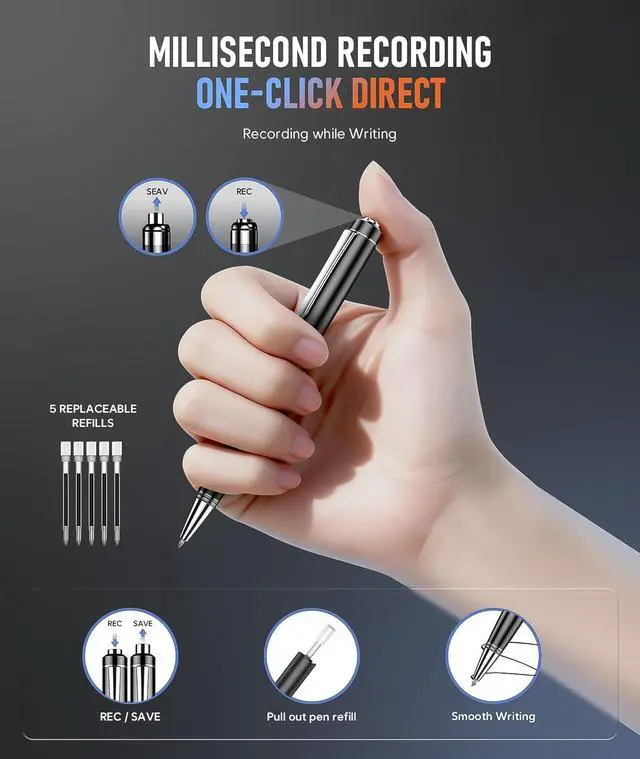^^ One Click Recording & Easy to Use - Super easy one step recording, long press the top button of the device for three seconds to start recording, long press again for three seconds to save. Each recording is time-stamped for easy finding of your files. Multi-platform compatibility allows you to use our device on any platform, you are also able to listen to your recordings directly on your device using headphones. ^^ Great Gift & Customer Service - This recorder allows writing while recording, which makes it a perfect gift for students, lawyers, business people, teachers, etc.