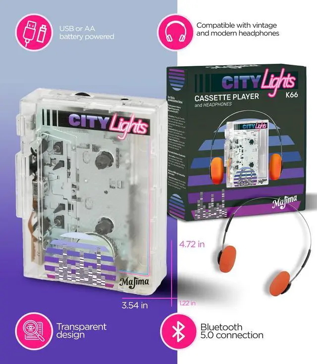 PERFECT GIFT FOR RETRO LOVERS AND COLLECTORS Delight your loved ones with nostalgia-meets-tech magic. Inspired by Guardians of the Galaxy and Stranger Things. Ideal for collectors and analog music fans alike. A standout piece for birthdays and special occasions. ^^ BLUETOOTH 5.0 FOR SEAMLESS MODERN MUSIC Enjoy wireless streaming with advanced Bluetooth 5.0. Connect to any device and play your favorite playlists. Also plays classic cassette tapes with authentic audio. Great for mixing old-school and digital music styles. ^^ ICONIC TRANSPARENT DESIGN WITH VINTAGE HEADPHONES See-through casing reveals the mechanical inside.