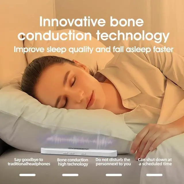 • Innovative Bone Conduction TechnologyUnlike traditional in-ear or over-ear speakers, this device leverages bone conduction technology to transmit sound vibrations directly to your inner ear, bypassing the eardrums entirely. This means no ear insertion, no blocked ear canals, and zero discomfort even when lying on your side for hours. It delivers a cozy, immersive audio experience while keeping your ears freeperfect for those who love listening to white noise, audiobooks, or soft music as they drift off to sleep or unwind after a long day.