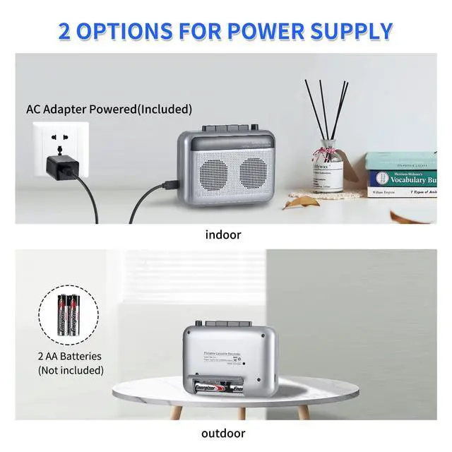 ^^ Compact and Portable DesignMeasuring just 4.7 x 1.5 x 3.7 inches and weighing only 0.42 lbs, this cassette player is perfect for on-the-go music lovers, providing a lightweight and space-saving solution to enjoy your cassette tapes anywhere. ^^ Eco-Friendly MaterialsCrafted from high-quality, eco-friendly materials, our cassette player prioritizes durability and environmental responsibility, ensuring you enjoy your music without compromising on sustainability. ^^ Convenient Power OptionsThe cassette tape player Bluetooth can be powered by an AC adapter (USB included) or AA batteries, offering flexibility and convenience for home use or outdoor adventures, along with a reliable after-sales service for peace of mind.