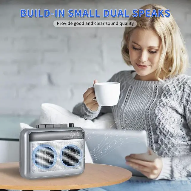Versatile Cassette PlayerOur Cassette Player Bluetooth allows you to seamlessly record and listen to your cherished old tape cassettes while supporting external microphone recording, offering a nostalgic experience combined with modern technology. ^^ Versatile Bluetooth ConnectivityThe Cassette Player Bluetooth features advanced Bluetooth 5.0 technology, ensuring stable and fast audio transmission to your Bluetooth headphones or Bluetooth speakers for an enhanced listening experience. ^^ Dual Speakers and Earphone JackEquipped with built-in dual speakers and an earphone jack, this cassette tape player Bluetooth allows you to enjoy your favorite tunes aloud or privately, catering to various listening preferences.