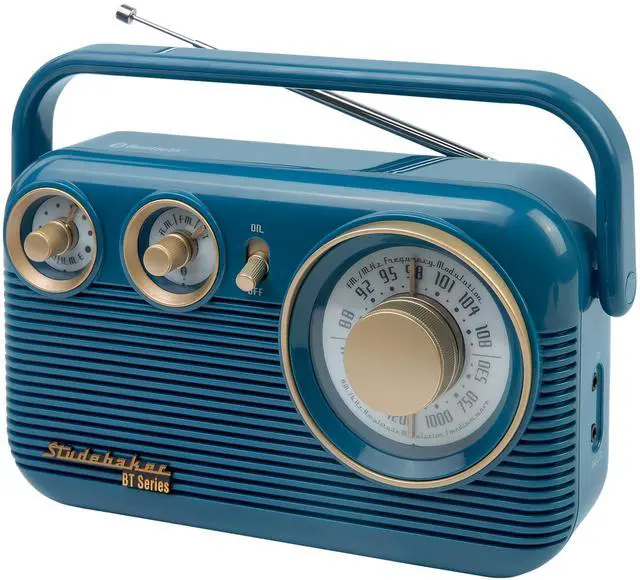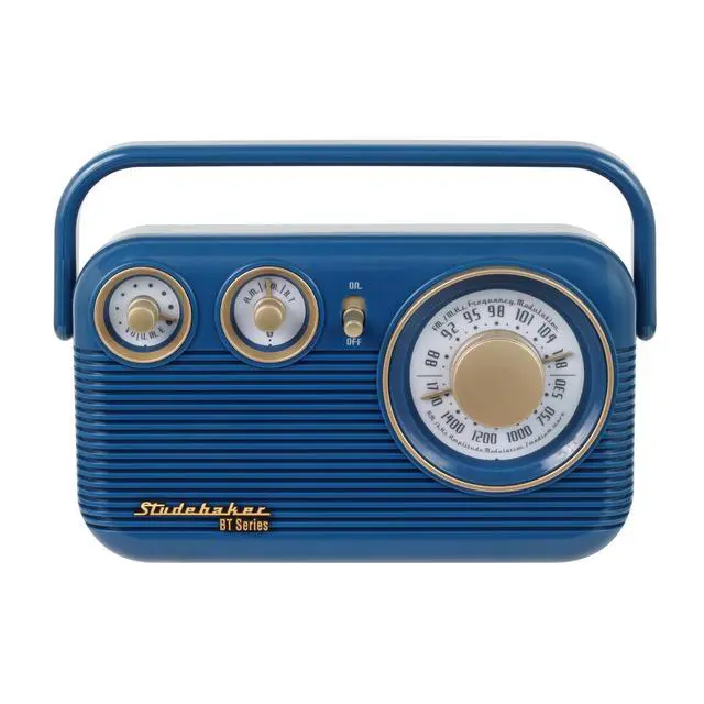 The Studebaker SB2003BT AM/FM radio is a retro portable radio with classic styling, and easy to use features. The large analog tuning knob simplifies adjusting to your favorite stations, along with AM/FM and volume knob controls as the speaker delivers excellent sound with clear and static-free audio. Play music from other devices like your tablet, iPod, MP3 player or other digital audio players through the built-in auxiliary input jack, connect your devices with Bluetooth compatibility or even listen in peace, connecting your favorite pair of headphones using the built-in 3.5 mm headphone jack.