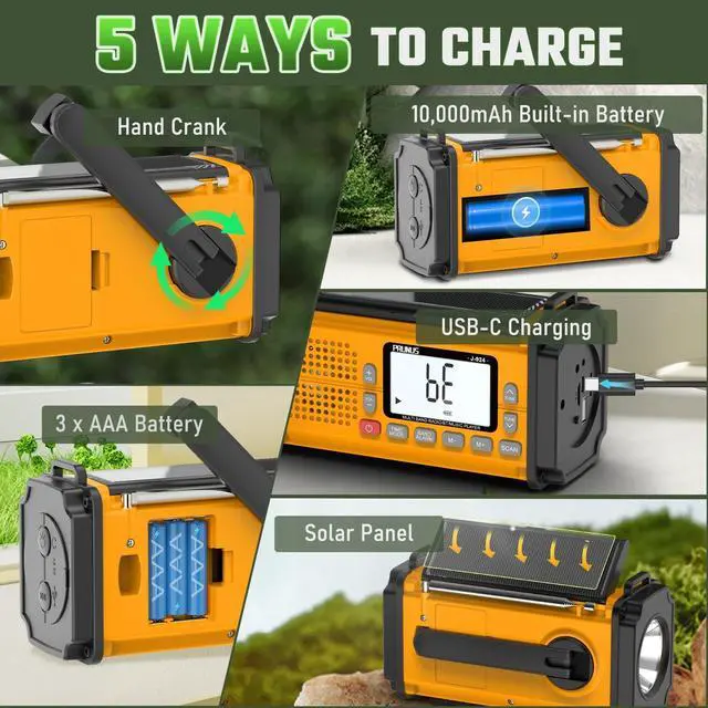 Power Supply: Built in an upgraded 10000mAh rechargeable battery for a super long battery life. USB-C charging is quick and convenient for daily use. Hand crank and solar charging are essential for camping or emergencies. Just pop in 3 AAA batteries to keep the solar radio going strong. You can expect a emergency weather crank radio that never loses power! (Note: Only internal battery can be charged, AAA batteries cannot be charged. ) ^^ 2