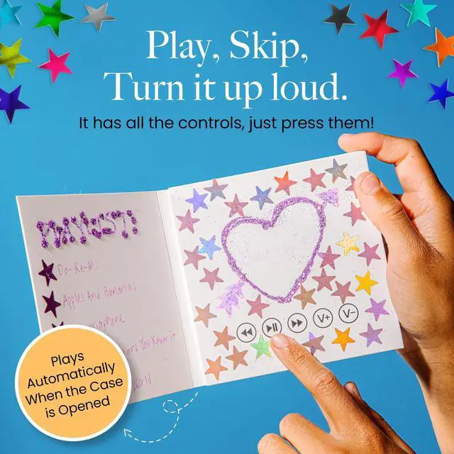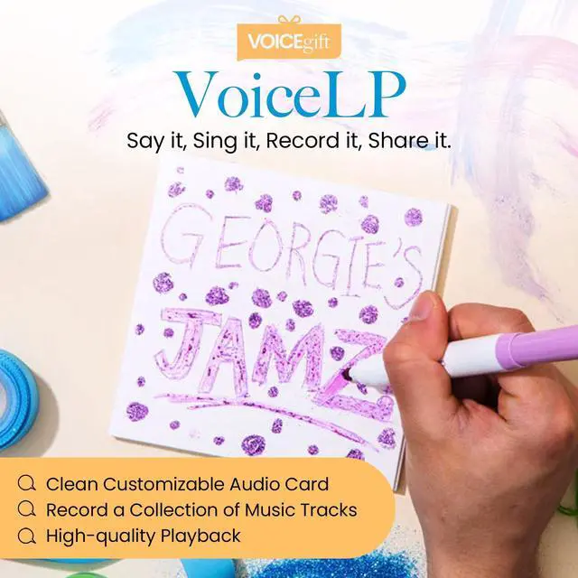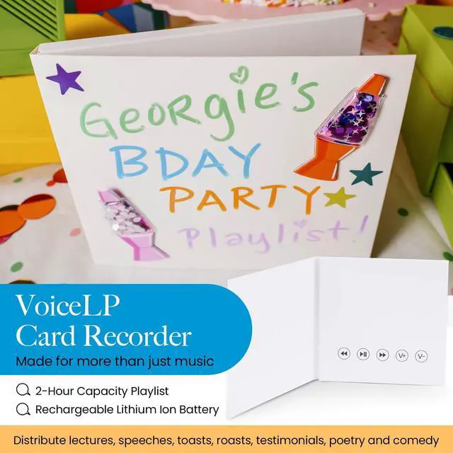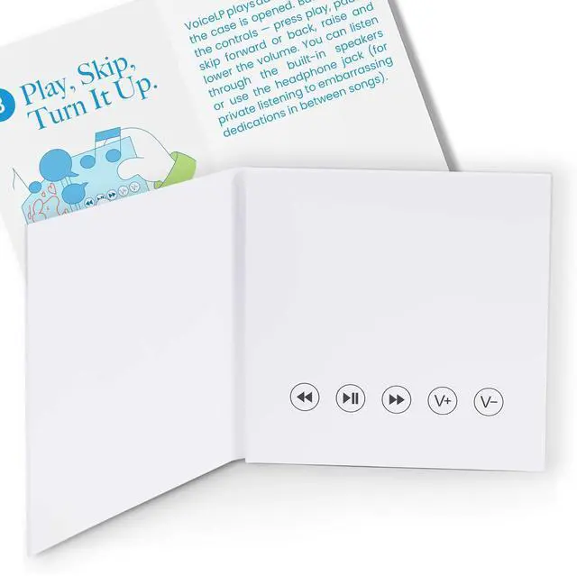 Custom Audio Greeting Card - Create unforgettable recordable gifts by easily uploading personalized MP3 or WAV files via included USB cable. Record messages, playlists, wedding speeches, or songs that automatically play when opened. ^^ Automatic Playback and Controls - Your personal voice recording gift plays as soon as the mixtape is opened. Includes play, pause, skip, volume controls, and a headphone jack for private listening, ideal for memorable messages and customized audio greeting card experiences. ^^ Customize Album Art and Tracklist - Personalize your VoiceLP with custom album covers and playlists.