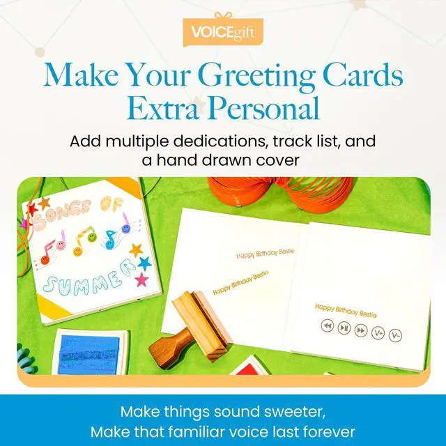 A modern upgrade to classic recordable cards, it includes a premium gift box for weddings, birthdays, or any custom card celebration. ^^ Rechargeable and Portable Audio Player - Easily recharge this lightweight sound card via USB. It's compact, portable, and perfect as a keepsake or for sharing thoughtful messages, stories, or music for personalized voice recording gifts on the go. ^^ Made by VoiceGift Built for Connection - VoiceGift is a trusted creator of unique recordable greeting cards that help families and friends bond across any distance. A meaningful way to capture memories and give a truly one-of-a-kind custom card.