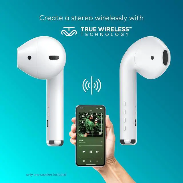 GIANT EARBUD-SHAPED BLUETOOTH SPEAKER: Get a giant Bluetooth speaker with over 30' of pairing range with this Coby speaker. It lets you enjoy low-latency audio and stable connectivity while you listen and includes a charging cable, a 3.5 mm AUX port, a USB-A slot, a TF card input, a built-in mic, and a radio.