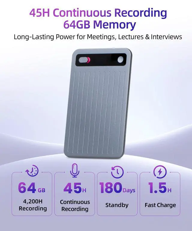 & Spacious: Carry the sleek 0.12 -inch aluminum AI recorder weighing only 0.99 oz anywhere with ease. With 64GB of storage for over 500 hours of recordings and 45 hours of continuous battery life, this recorder is perfect for long meetings, lectures, interviews, or on-the-go creativity. Record anytime, anywhere without worrying about storage or power.