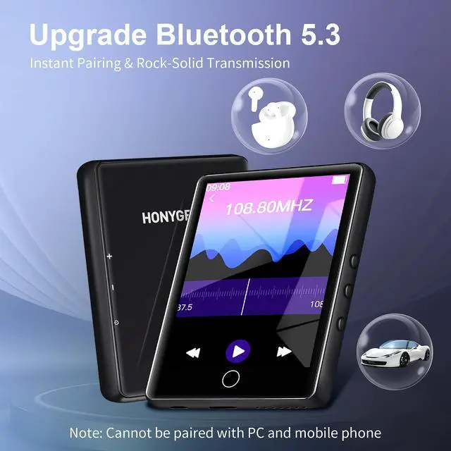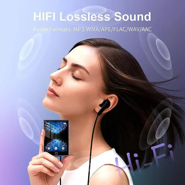 2.8" Full Touch Screen & MultifunctionalNavigate effortlessly on the 2.8 -inch large touch screen. Beyond music, this versatile MP3 player includes an FM radio (wired earphones as antenna), voice recorder, e-book reader, and more practical tools. ^^ Advanced Bluetooth 5.3 ConnectivityExperience superior wireless freedom with this MP3 player. The latest Bluetooth 5.3 provides faster, more stable connections, extended range, and lower power consumption for your headphones or speakers. ^^ Hi-Fi Lossless Sound & Built-in SpeakerEquipped with a premium audio decoding chip, this player delivers Hi-Fi lossless sound quality, supporting formats like FLAC and APE.