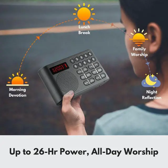 Designed for high-frequency use, its intuitive layout ensures 95%+ blind-operation accuracy, empowering personalized listening workflows. ^^ 26-Hour Marathon Playback Equipped with a long-lasting rechargeable battery, this Bible player delivers up to 26 hours of continuous use on a single 2-hour USB-C charge. A real-time power indicator on the screen eliminates guesswork, ensuring uninterrupted study or worship sessions. ^^ Accessible Design for All Ideal for seniors, visually impaired individuals, dyslexics, or those preferring auditory learning. Features high-contrast text, oversized buttons, crystal-clear audio output, and ergonomic controls.
