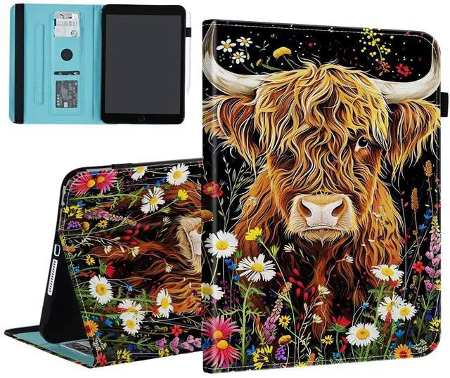 BFUKVOU Case for iPad (A16) 11th Generation 11 Inch 2025, iPad 10th Generation 10.9 inch 2022,Card Slot PU Leather TPU Case Pen Holder Auto Wake Sleep,Highland Cow Flowers
