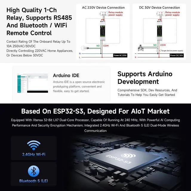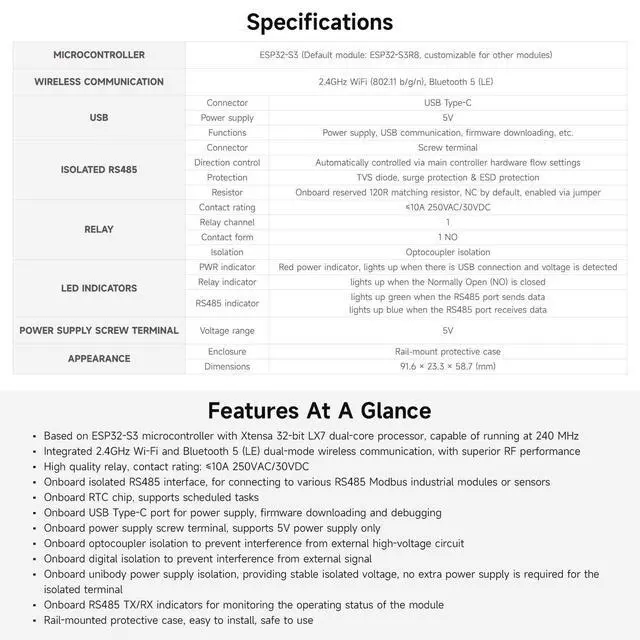 Powered by Xtensa 32 - bit LX7 dual - core processor with a high 240MHz main frequency for reliable performance. ^^ Integrated 2.4GH z Wi - Fi and Bluetooth 5 (LE) for excellent RF communication in various scenarios. ^^ High - quality relay supports loads of 10A 250V AC or 10A 30V DC for diverse industrial applications. ^^ Onboard isolated RS485 interface and multiple isolation circuits (optocoupler and digital) ensure stable operation and protect against interference. ^^ Equipped with RTC, USB Type - C, rail - mounted housing, and status indicator lights for easy development, installation, and monitoring.