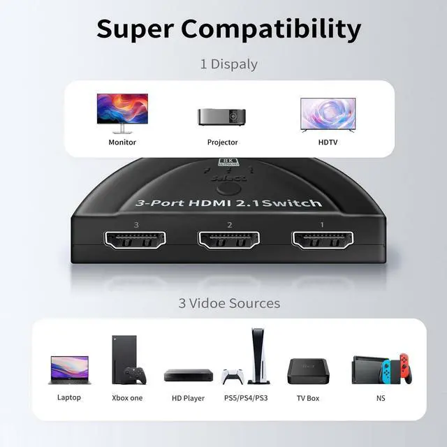 Resolution]: The HDMI switch box supports a wide range of resolutions, including 8K@60Hz, 8K@30Hz, 4K@120Hz, 4K@60Hz, 1080p@120Hz, 1080p@60Hz, 720p, 480p, and more. The 3-port HDMI switch is also compatible with HDMI 2.1, HDCP 2.3, HDR10, Dolby Atmos, Dolby Vision, and 3D. ^^ [Self-Powered, Plug and
