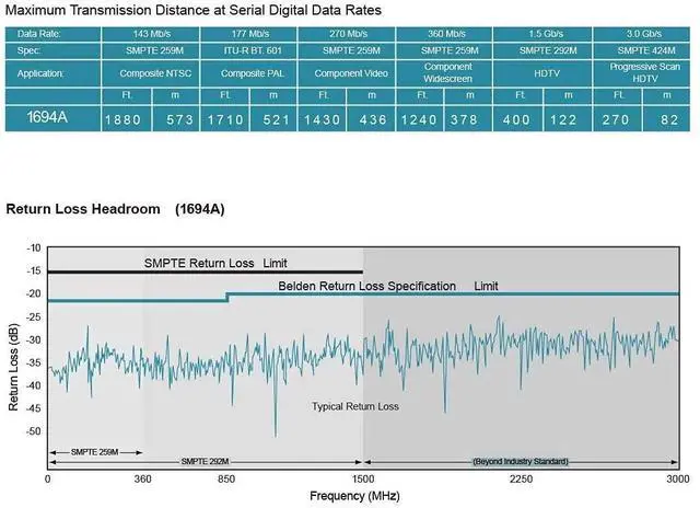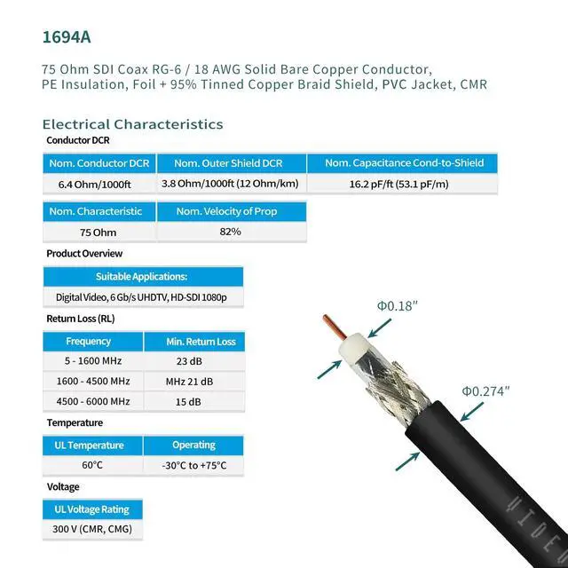 Impedance: 75 Ohm ^^ Special process connection to ensure BNC connectors do not fall off easily ^^ BELDEN 1694A PRECISION SERIAL DIGITAL VIDEO COAXIAL CABLE: features exceptionally low attenuation and a 4.5 GHz Bandwidth in an RG6 coax cable. Featuring RG-6/U type, 18 AWG solid. 040" bare copper conductor, Gas-injected FHDPE - Foam High-Density Polyethylene + tinned copper braid shield (95% coverage tinned copper braid combined with Duofoil foil/poly/foil 100% shield), PVC - Polyvinyl Chloride. ^^ In the field of professional video production and broadcasting, SDI cables can be used to connect to other equipment for signal transmission. Such as cameras, video monitors, video switchers, routers, broadcast cameras, video encoders, video servers, Production Studio SDI 4K Video Switch, TV antenna baluns, HD video cameras etc.