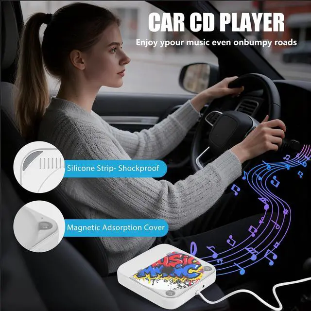 Anti Vibration DesignThis car CD player is equipped with a shock absorption system, which eliminates the vibration of the music player. Our portable CD player for car can play smoothly even on bumpy roads. It is equipped with four anti slip rubber feet at the bottom, which can effectively absorb shock and stabilize the body. At the same time, it adopts a magnetic adsorption cover design, which is easy to operate, has good sealing performance, and can effectively prevent dust from entering. ^^ Wide Compatibility with Vehicle ModelsThe external cd player for car is compatible with most cars, whether they have built-in CD functionality or not.