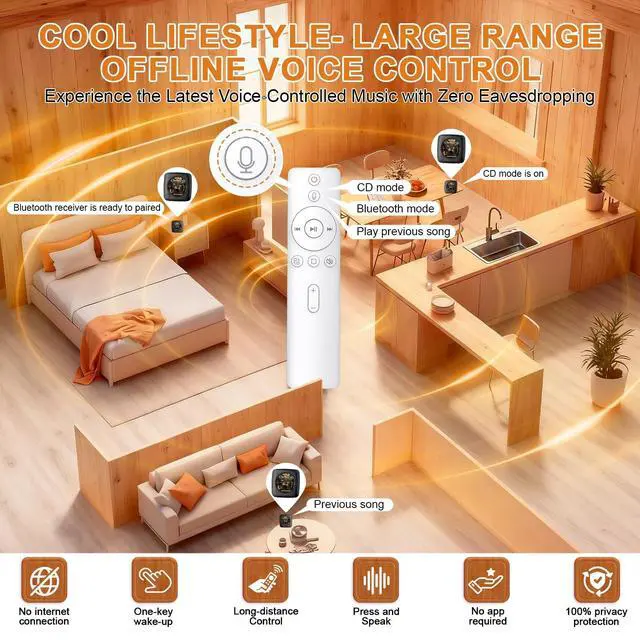 Control CD Player: Experience the future of audio control. As the first offline voice-controlled CD player, Gueray processes all commands locally via the remoteno internet, no cloud, no privacy concerns. Hold the voice button and speak naturally to control playback, volume, and modes from up to 50-Meter range without obstructions ^^