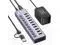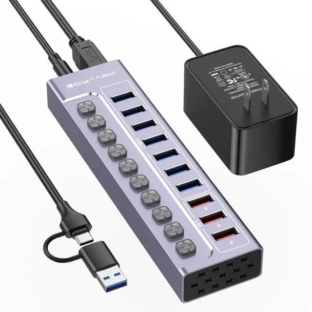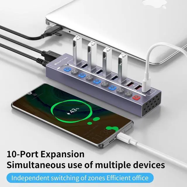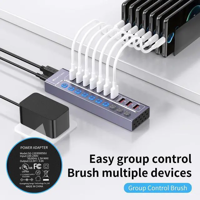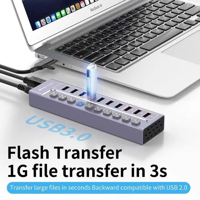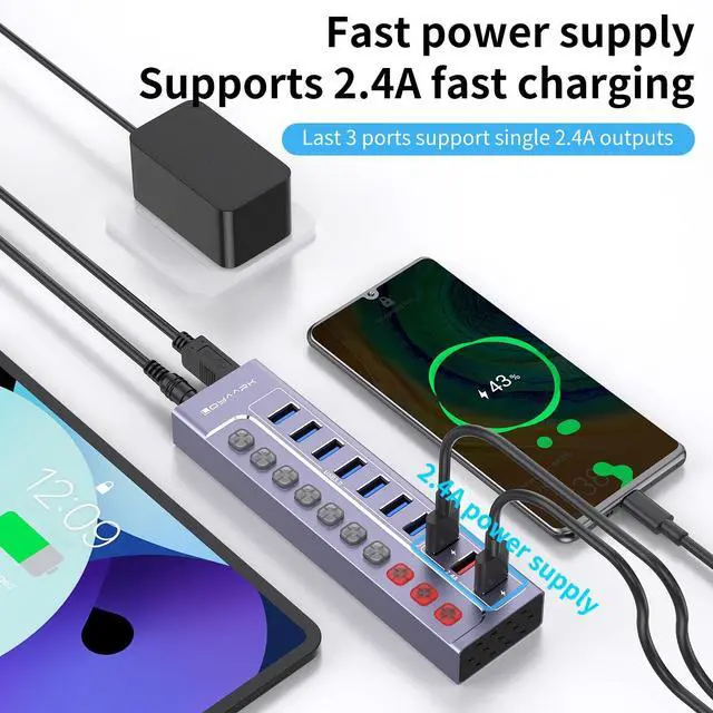 10-Port Powered USB Hub 3.0I nstantly turns a USB hub into 7 USB 3.0 ports, 3 smart charging ports for 2.4A only, supports USB flash drives, keyboards and mice, printers, hard drives, and other USB peripherals; Plug and Play, no driver required, hot-swappable. ^^ Safe & Stable ChargeEquipped with a 12V3A UL-Listed Power Adapter power adapter to provide sufficient power supply and connect multiple high-power devices simultaneously and steadily. ^^ 5Gbps Data Transfer SpeedThis USB hub splitter 3.0 syncs data at blazing speeds up to 5Gbps, which is more than 10 times faster than USB 2.0, fast enough to transfer an HD movie in seconds.
