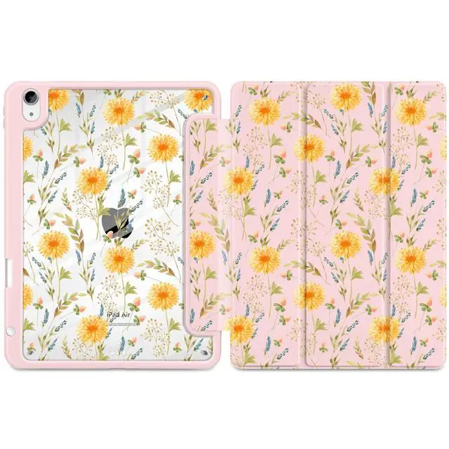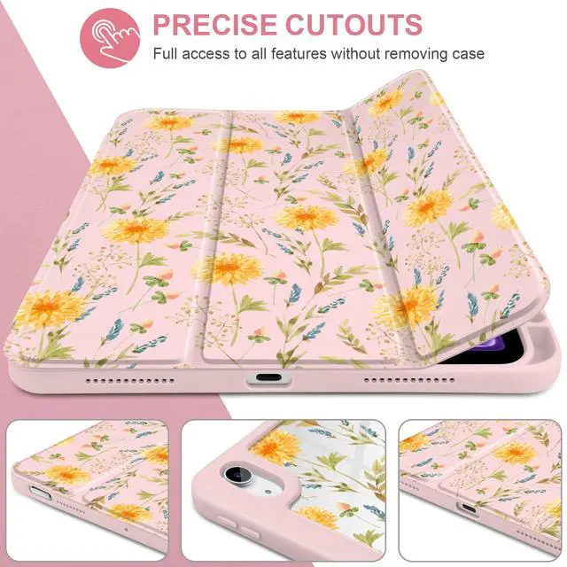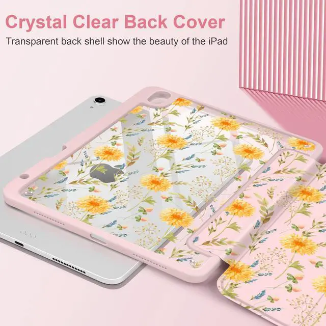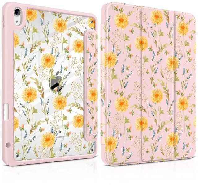 Yebiseven Case for iPad Air 11 Inch M4 M3 M2 2026 2025 2024, iPad Air 5th 4th Generation 10.9 Inch 2022 2020-[Pencil Holder], Shockproof Clear Hard Back, Trifold Stand,Auto Wake/Sleep, Yellow Floral