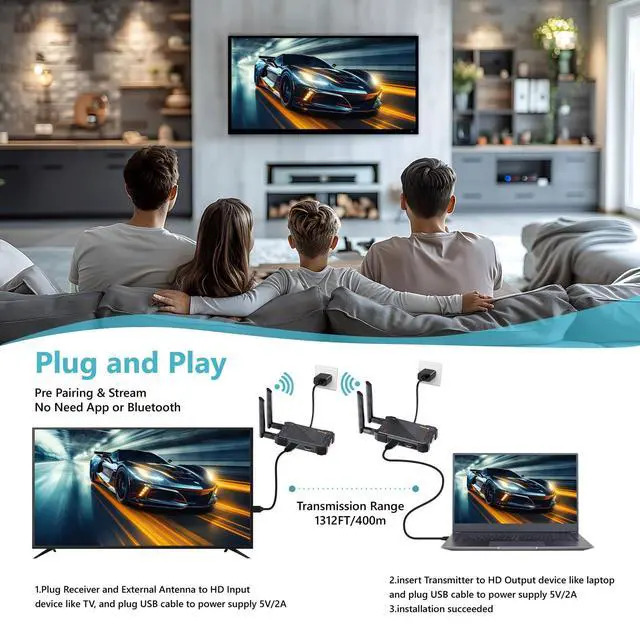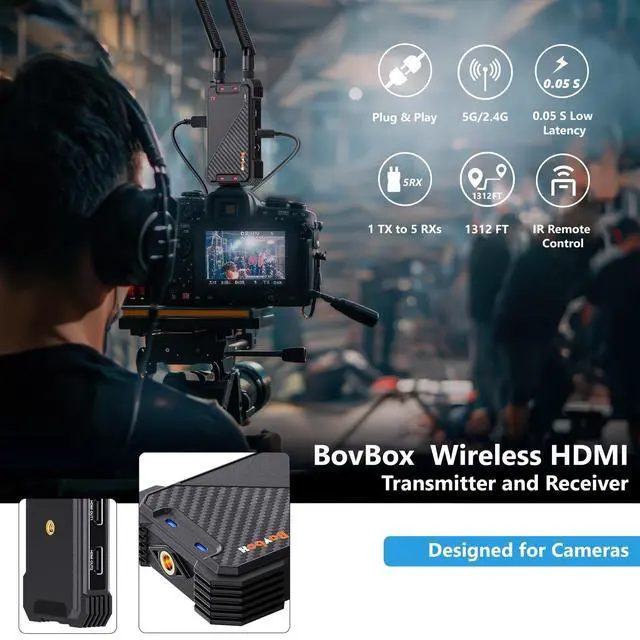 Plug & Play and Dual BandBovBox Wireless HDMI Transmitter and Receiver would be paired right out of the box so that it truly plug and play. The HDMI Wireless Transmitter and Receiver come with dual band chip ( 2.4G & 5G) and LDS antenna, which can deliver fast, stable and long-range transmission up to about 1312ft ^^ 1080 FHD Picture QualityThe Wireless HDMI Extender Kit supports ultra-high-definition output at 1080p@60Hz. You can enjoy the most realistic and immersive experience on a big screen, 0.05 s latency, suitable for real-time games and sports programs ^^ Loop-Out and IR Remote ControlThe HDMI Sender and Receiver Wireless requires no system installation, Allow source device to recognize remote commands; just point the remote control to the IR emitter attached to the source device to control, There is an additional HDMI output at the transmitter end, allowing you to add a local display for monitoring ^^ Support Up to 1TX to 5RXsWith the Wireless Video Transmitter and Receiver, allows you have up to five receivers bound to one transmitter.