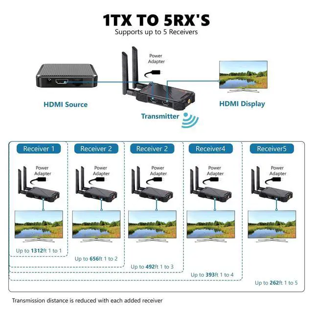 As RX increase, the wireless transmission distance will be shortened ^^ Wide CompatibilityThese Wireless HDMI Adapter Kits are lightweight and easy to carry for outdoor business presentation. Compatible with most HDMI output devices, laptop, PC, Camera, DVD, DSLR, Set-top boxes, Cable/Satellite boxes, tablet and more. Suitable for conference rooms, home entertainment and multimedia education, church projections, outdoor photography, and video shooting