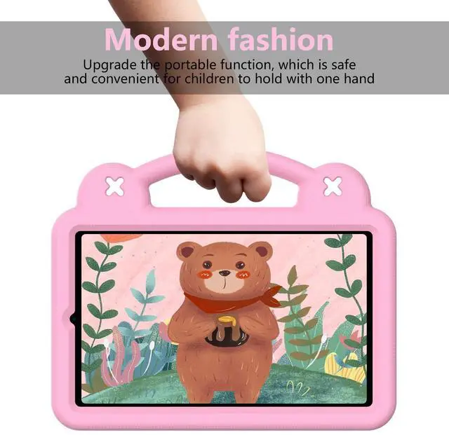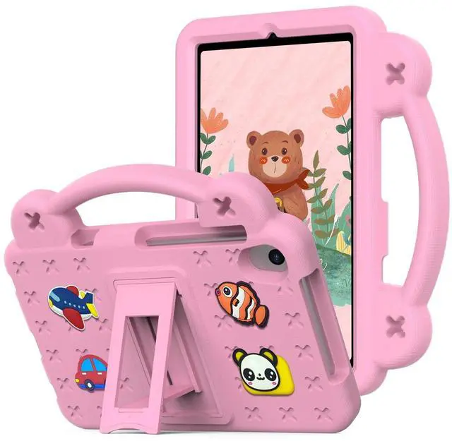 (Note: the product does not contain screen protector) ^^ [Cute DIY Design] There are some cute cartoon doll on the back, you can insert them into the holes on the back. ^^ [Sturdy Stand] The built-in PC stand firmly supports the tablet, allowing you to watch videos comfortably. ^^ [Non-slip Handle] Portable handle, elegant design, allows children to take out the tablet easily.